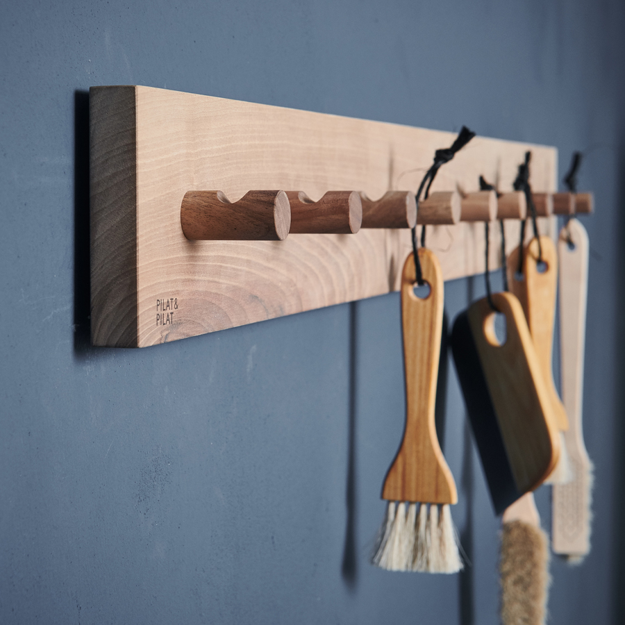Kapstok met 9 haakjes. Afmetingen 90 x 7 x 10 cm (lxbxh). Mogelijk in eiken, licht iepen of walnoot
