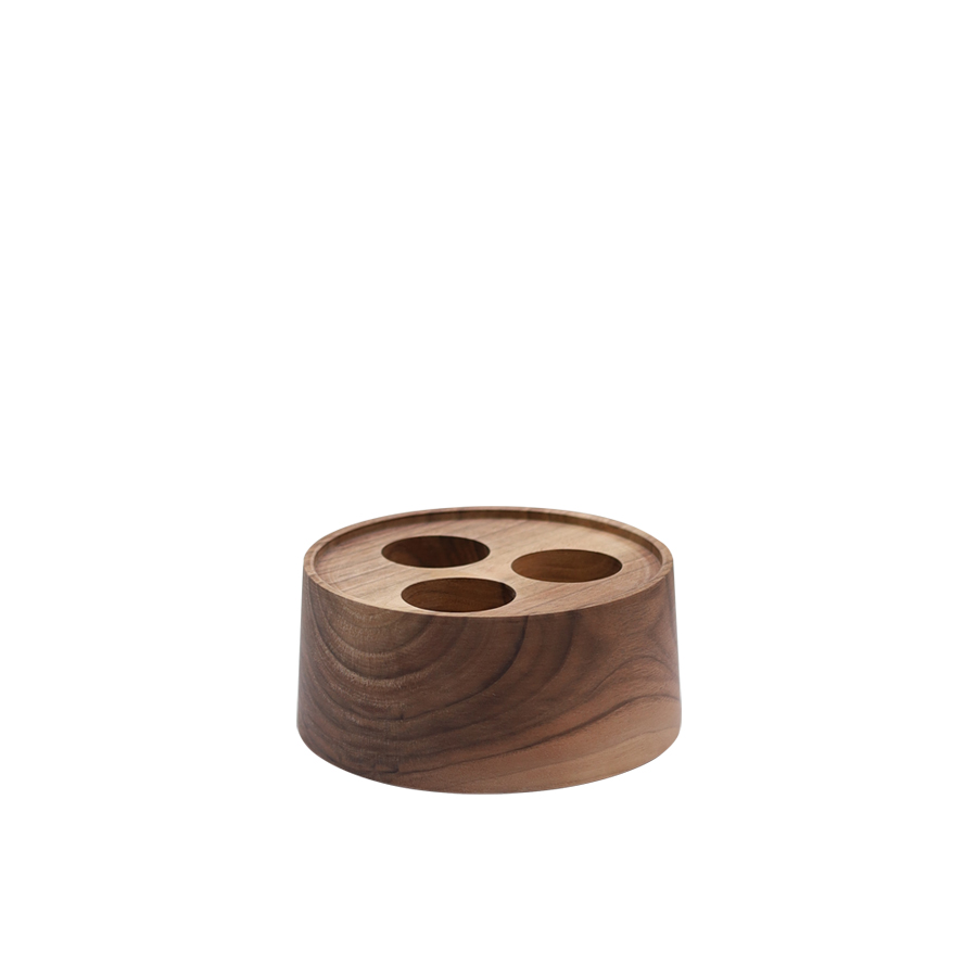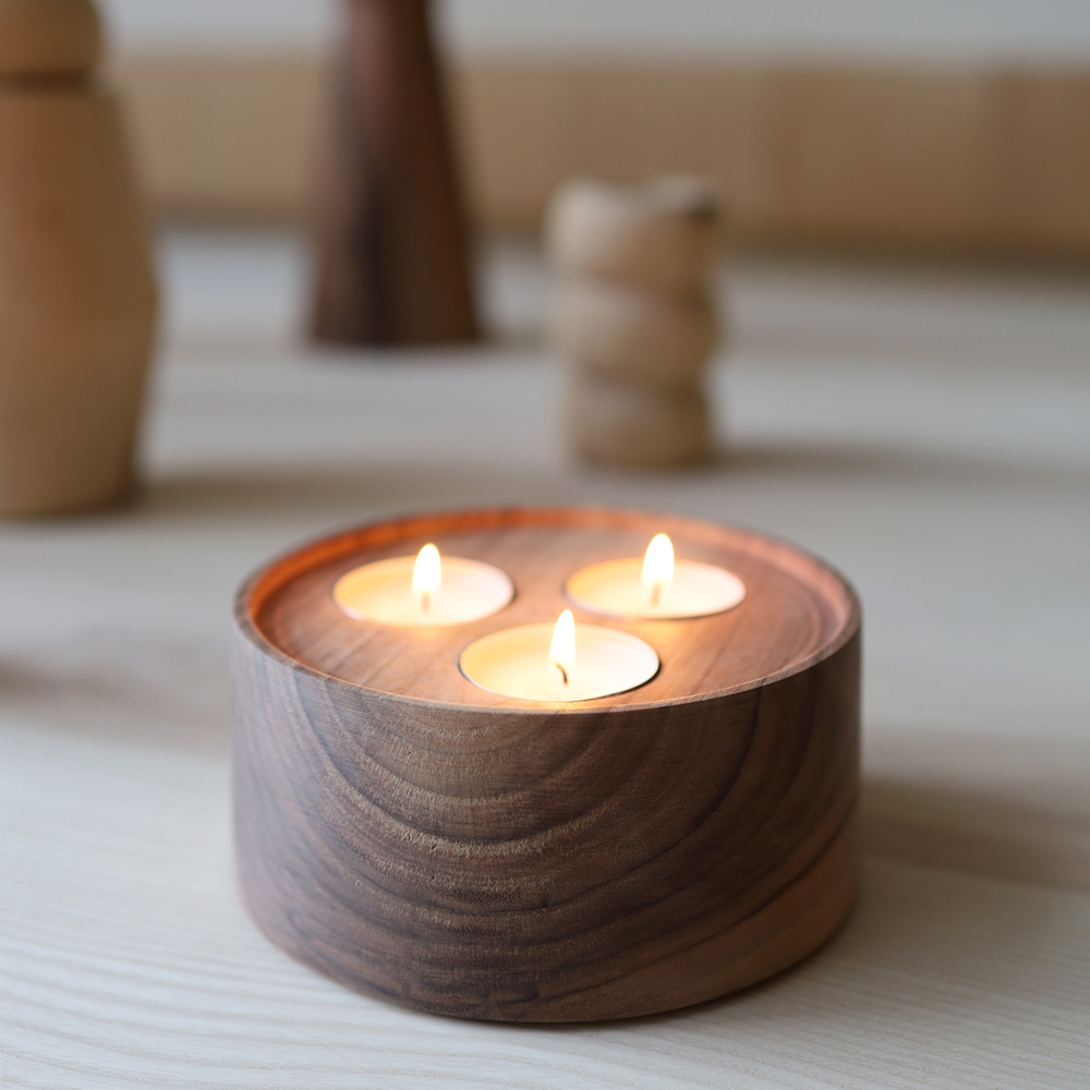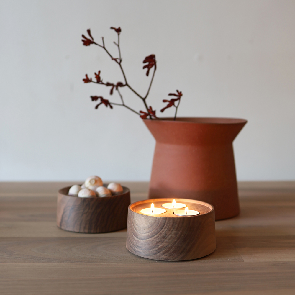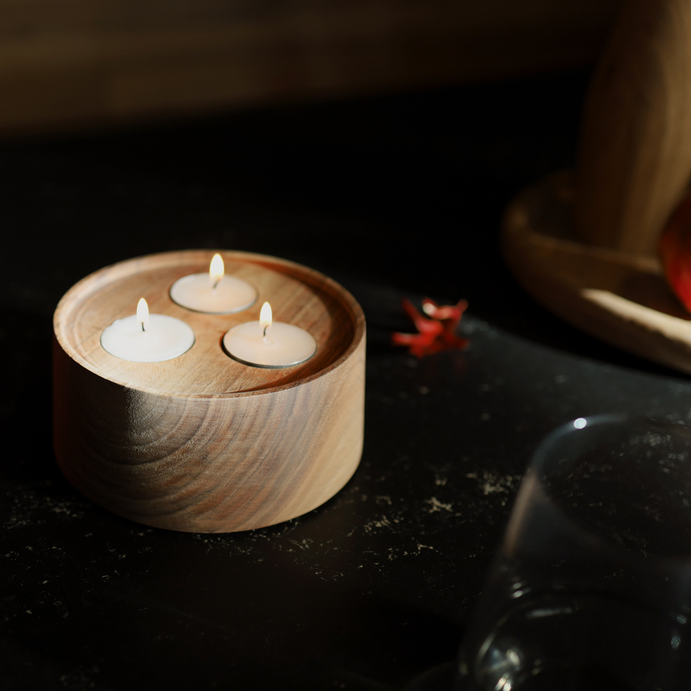 Licht in het donker met deze waxinelichthouder geschikt voor drie waxinelichtjes. Hand gedraaid in de houtdraaierij in Bosnië, elk stuk draagt het stempel van ambacht en aandacht. Doorsnee 14cm x 6 cm hoog. De doppio waxinelichthouder is verkrijgbaar in walnoot. Zie ook de Doppio kom en kandelaars.